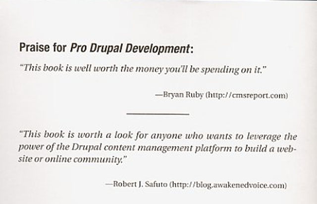 I knew the publisher liked my first impressions of the book that I included in a post a couple months ago. However, I had no idea I would be quoted in a second print of the Pro Drupal Development nor what would be quoted. Since I obviously bought the book before I had anything worthy to say about the book, my copy of the book does not have a quote by me.