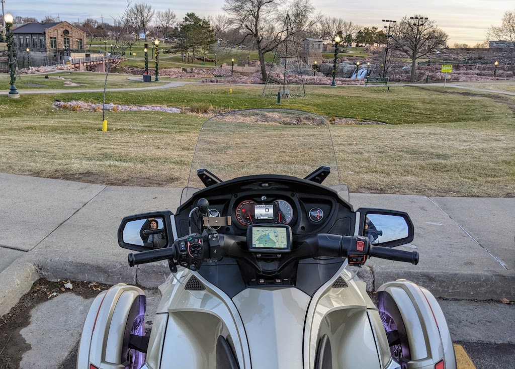 The normal high temperature for Sioux Falls this time of year is 37 deg F. But yesterday was a different story as afternoon temperatures on December 1, 2021 reached to a high of 61 deg F. I took advantage of these warmer temperatures by riding my Spyder at the end of my workday through downtown Sioux Falls and Falls Park as sunset approached.