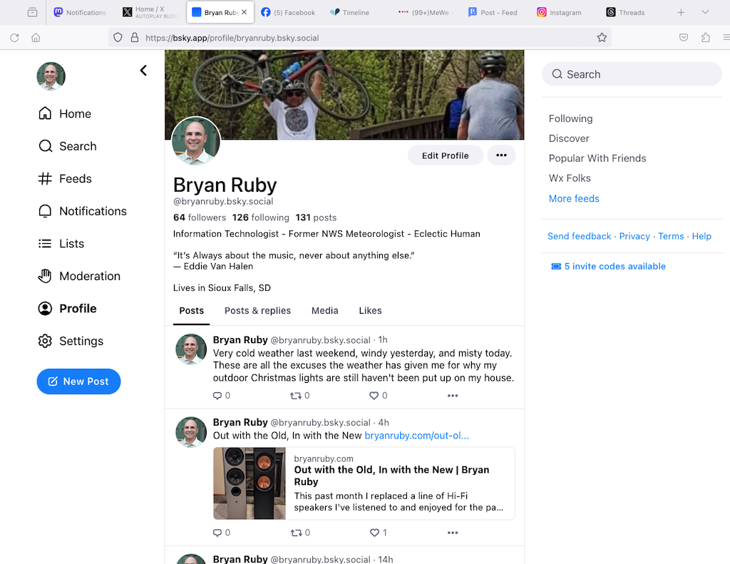 I currently know few people on Bluesky and I would like to change that. If you are currently a member on Bluesky, you can find me through username: @bryanruby.com. Unfortunately, if you don't have an account you'll either need to get an invite code first from somebody already on that platform or by joining Bluesky's waitlist.